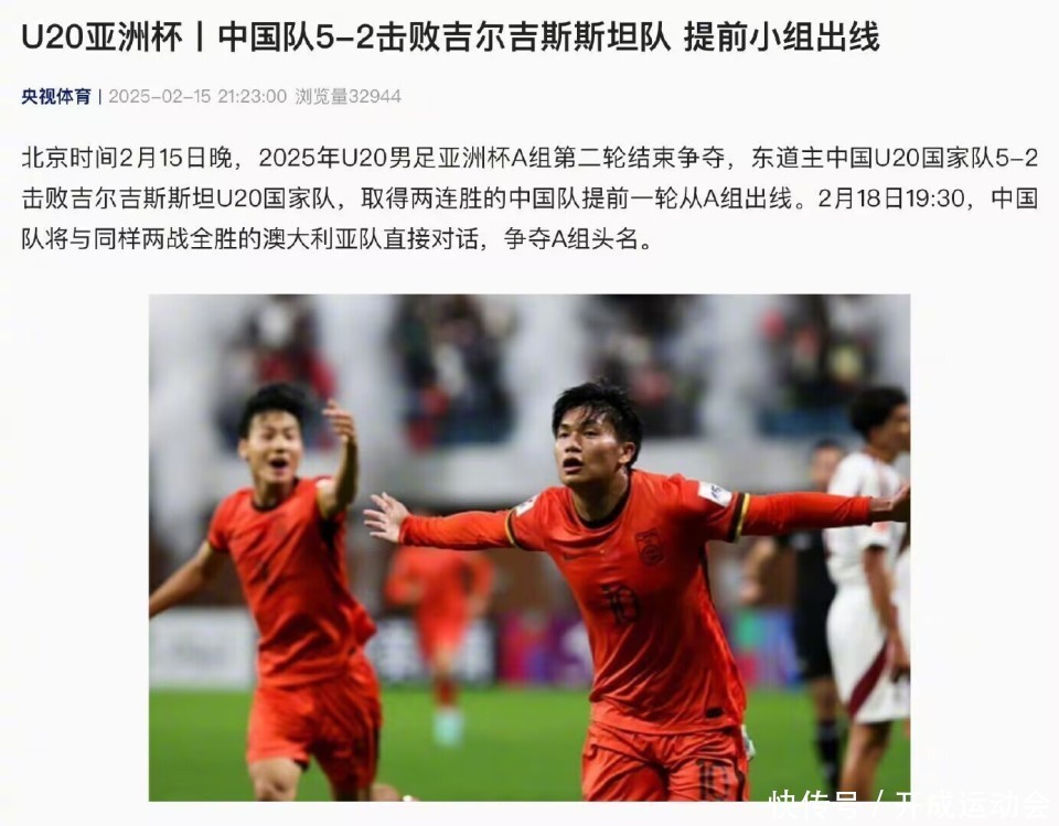 U20亚洲杯,中国U20对阵吉尔吉斯斯坦U20的比赛中,中国队表现出色,最终以5比2的大比分获胜。